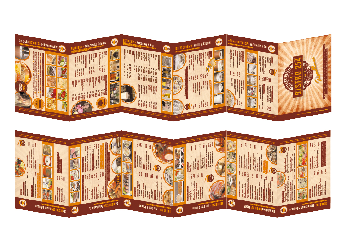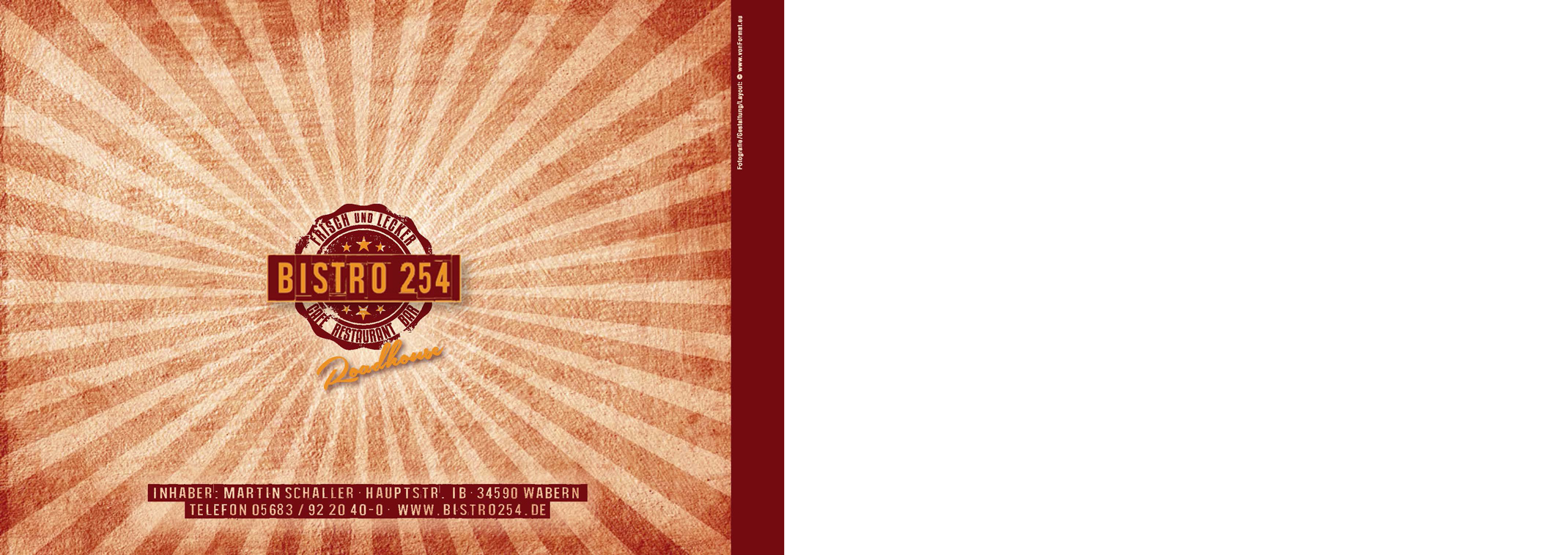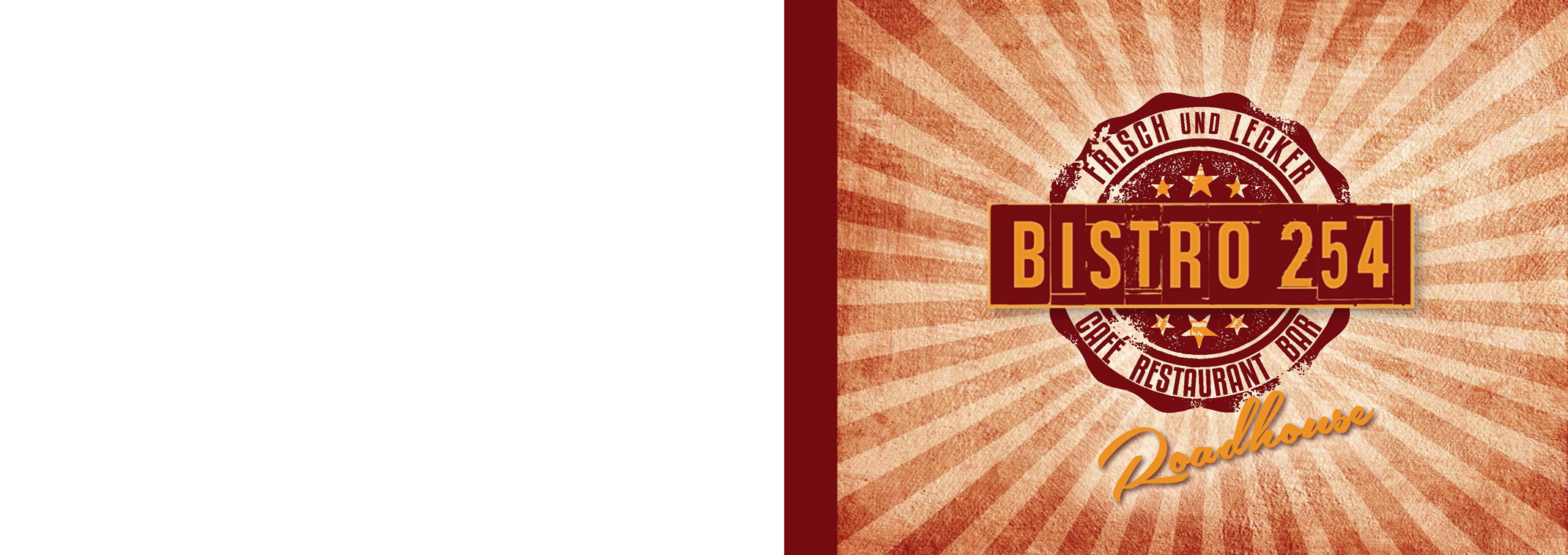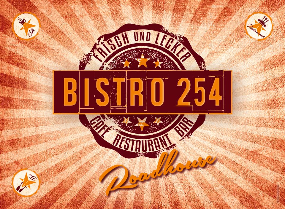 Speisekarte SchaukastenKonzeption | Umsetzung: Großformat für Schaukasten | Format 88 x 34 cm Bistro 254 Roadhouse Speisekarte to GoKonzeption | Umsetzung: Format DIN A6 | 12 Seiten Leporellofalz Idee Außenwerbung Großformat-HausschildKonzeption | Entwicklung | Umsetzung Bistro 254 Roadhouse - Außenwerbung Großformat-SchildKonzeption | Entwicklung | Umsetzung Autobeschriftung LogoUmsetzung SchneidebrettGlasschneidebrett ca. 40 x 30 cm Bistro 254 Roadhouse LogoKonzeption | Entwicklung | Umsetzung Bistro 254 Roadhouse ICONsKonzeption | Gestaltung Veranstaltung Großformat-AußerbannerAußenbanner-Plane | Format 450 x 80 cm Bistro 254 Roadhouse Logo | Speisekarten | Großformat-Außenwerbung